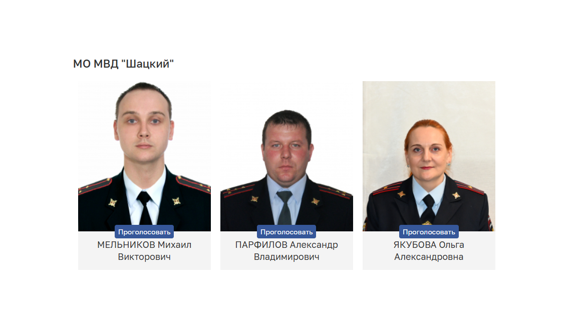 От Шацкого района района в конкурсе участвуют сотрудники МО МВД «Шацкий» Михаил Мельников, Александр Парфилов и Ольга Якубова.